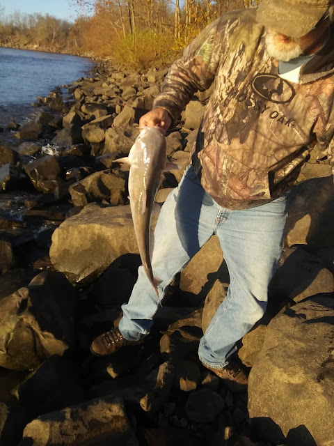 I would go fish at a different section of this of this river when the cf/s was at 82,000, but the night before it was 30,000 cf/s. It rose 4.5 vertical feet in 4 hours!..lol... I would be here to see if I could hook a fish! I would show up and two bait fisherman would be using to light of a weight and it would slowly be parallel with the bank of the river in short order. I go and sit down from them and mind my own business. After they lost about 4 rigs I piped up. I asked them if I could give them some advice. I asked them how many ounces of lead they were using they said 3. I said you need to double it and cast up stream at such an angle the bait would come to rest right in front of them. The one guy had to leave, but the other stayed. He rigged the weight as I recommended and casted out into the flood waters. Even know she was cranking at 82,000 cf/s her clarity was 18”-20”. It was not muddy but it was very turbid. In about 20 minutes after he got his cast just right and the weight n bait came to rest in front of him it happened. His rod was almost pulled out of the rocks by what would be a small Blue Kitty. I was happy for the guy and he needed a photo of him with it cause his buddy would not believe him. I took his photo and showed his friend and later texted him the photo. I could not stand by and watch ppl try to fish and not understand how they could be doing so much better. I'm not pro but I wanted to help and this time it worked out with the desired effect.