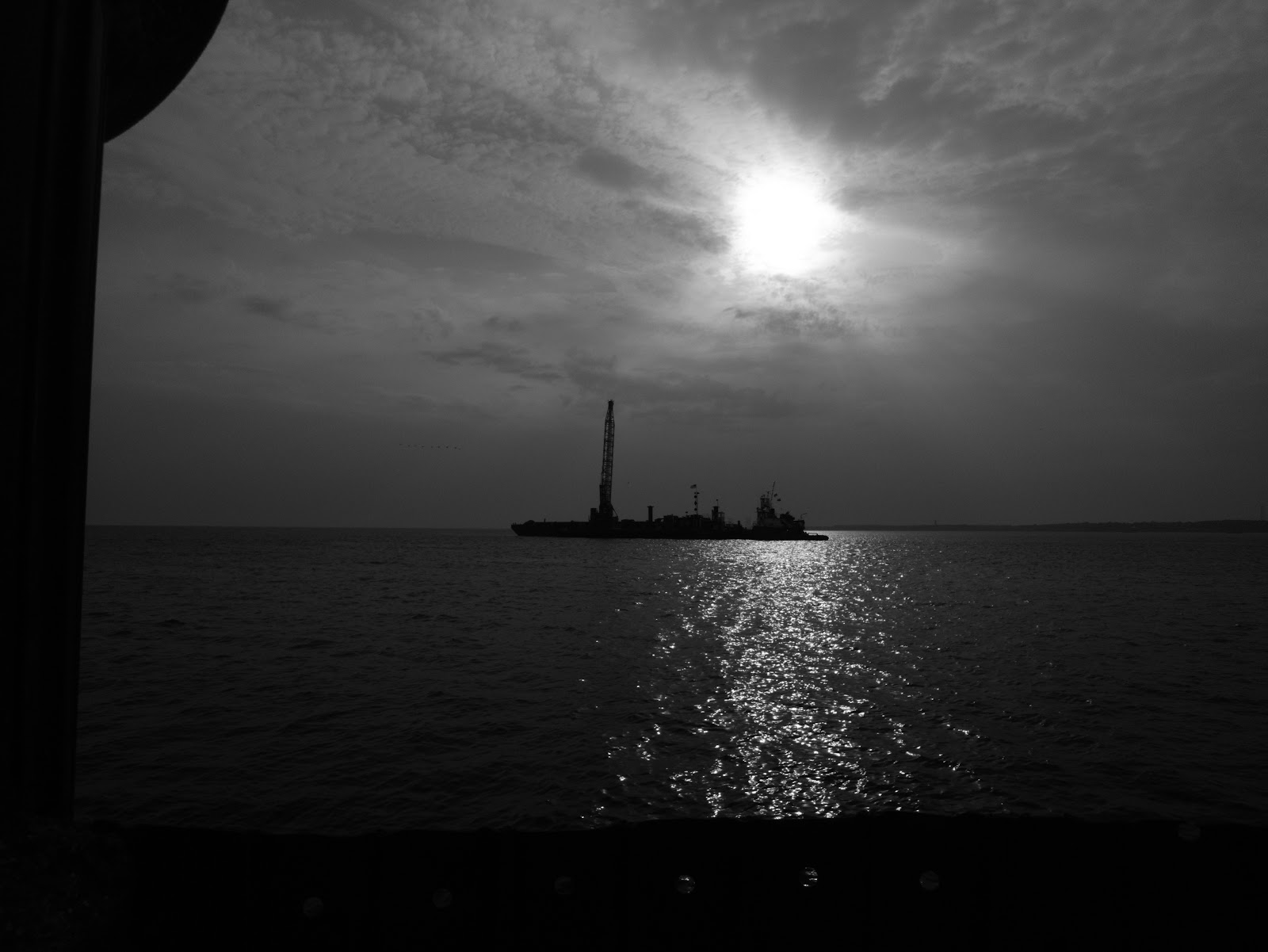 The winds were out of the SSW and no one was home. This breakwall was built out of metal sheeting and from what I could tell the structure was not condusive for smallie fishing atleast for me. I shall look for new water else where. Here is a dredge doing dredge things!